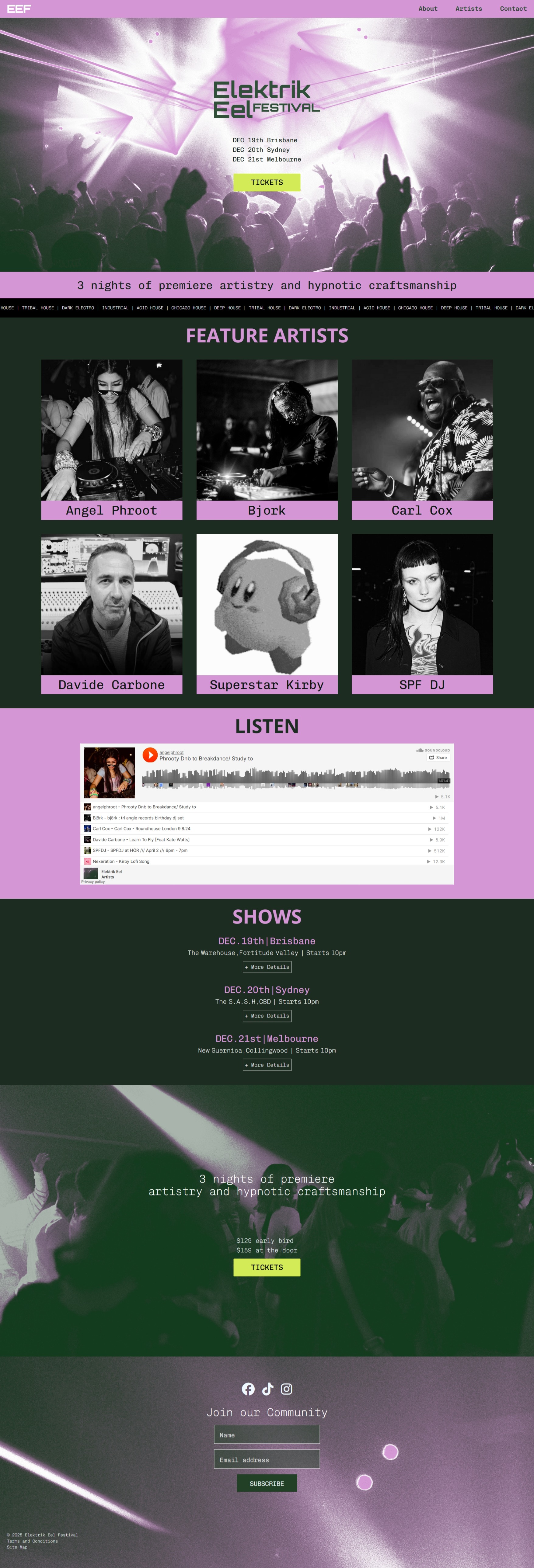 Landing page and festival poster. Brand colours associated with swamp imagery and neon electric. Pink is a complimentary colour to green, provides a distinctive brand voice. Not using common black and red.