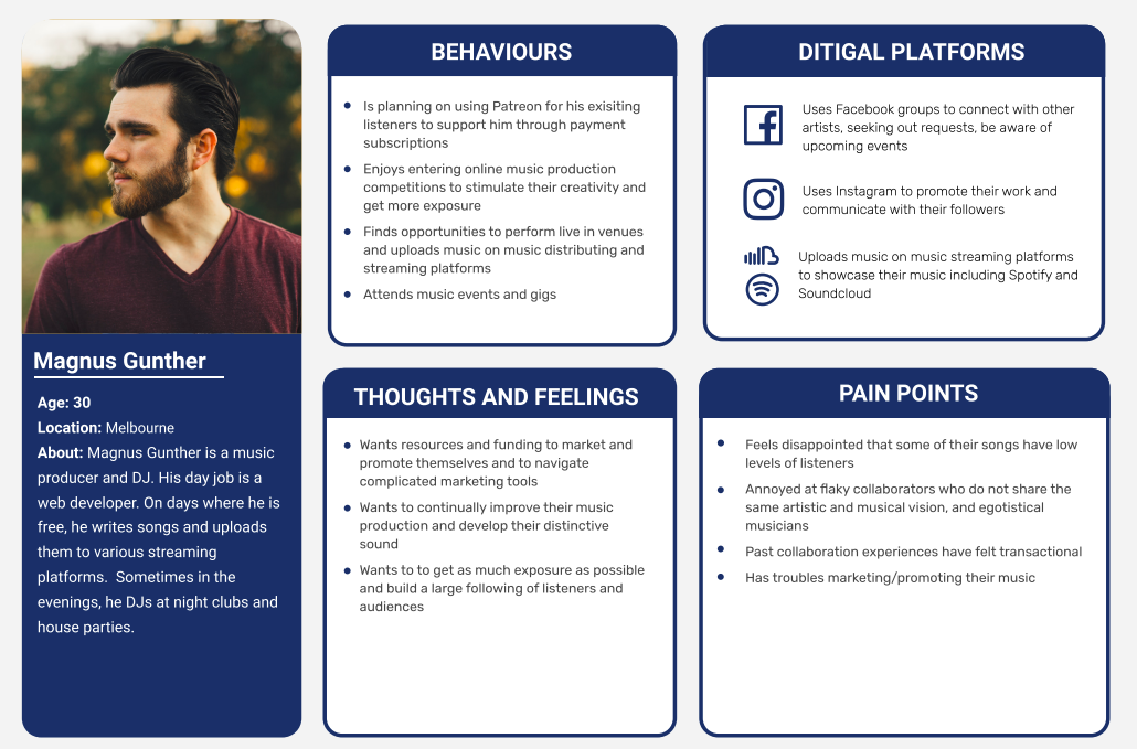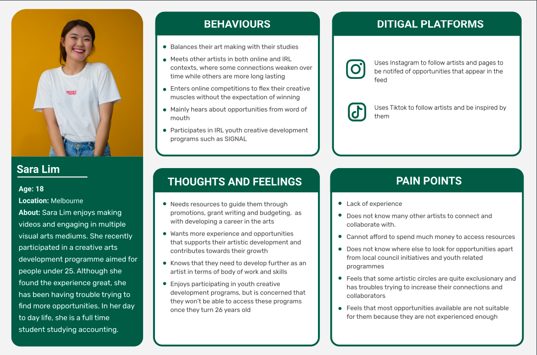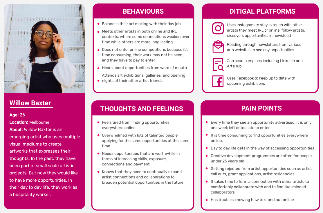 I chose not to base my customer journey map on this persona, because their main needs seem to be geared towards promotion, which the Emerging Arts Hub has limited resources and knowledge in.