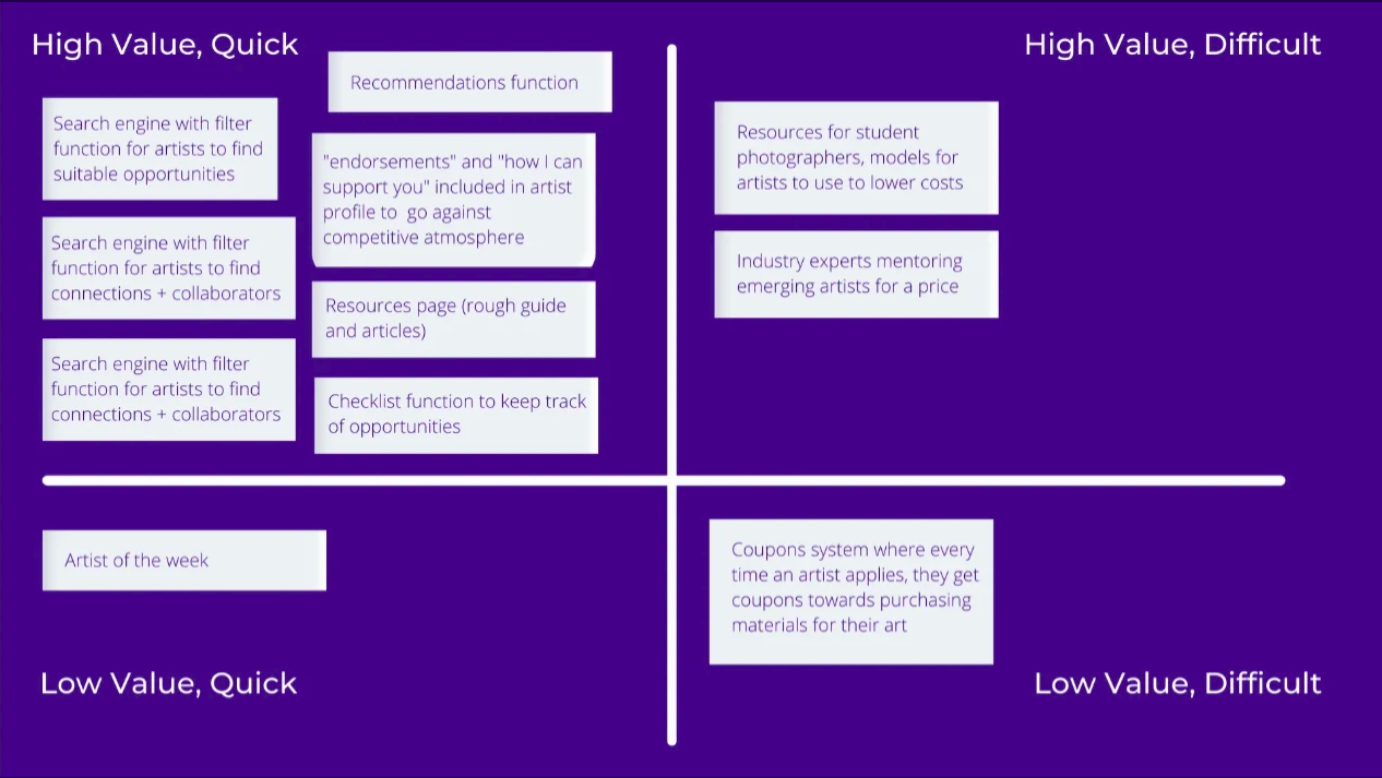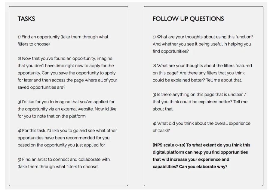 I created a problem statement to focus on the problem I needed to explore and solve, which helped my research to direct itself towards gaining an overview of what kind of difficulties artists face in finding and getting opportunities (beyond my own experiences) and finding out if artists are satisfied with how they currently find and get opportunities: