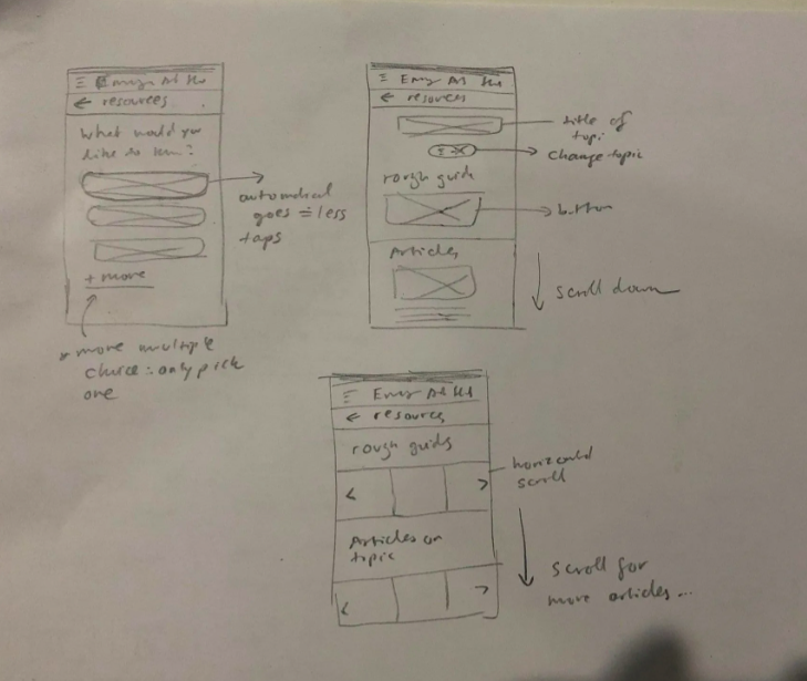 3) After looking back at research notes and in the brain writing session, I decided to be more attentive to user research findings by adding in a resources page. This was to be less biased of my main idea of a search function.