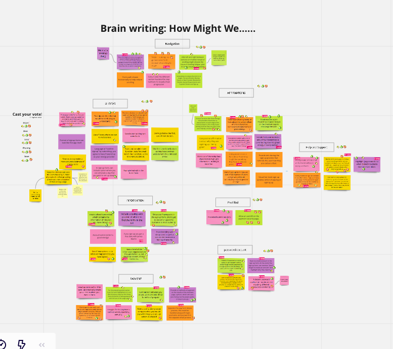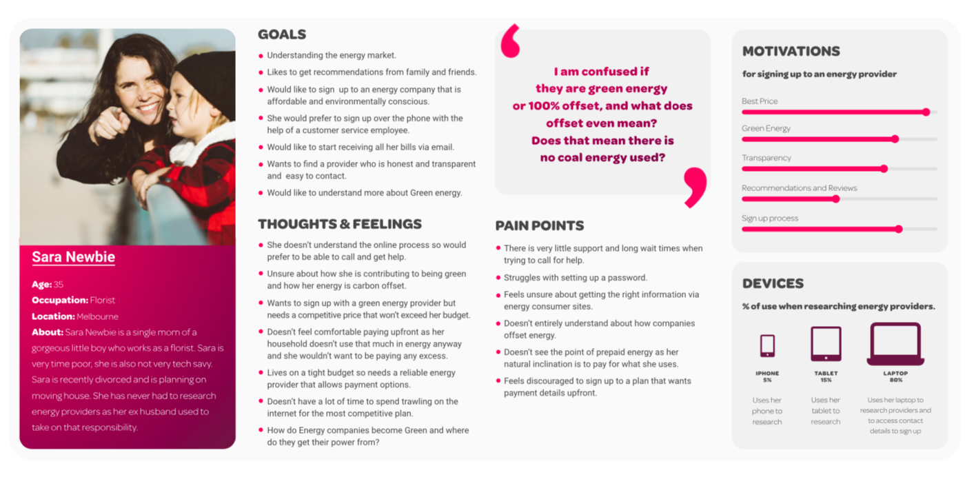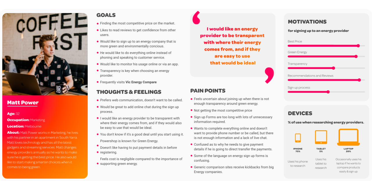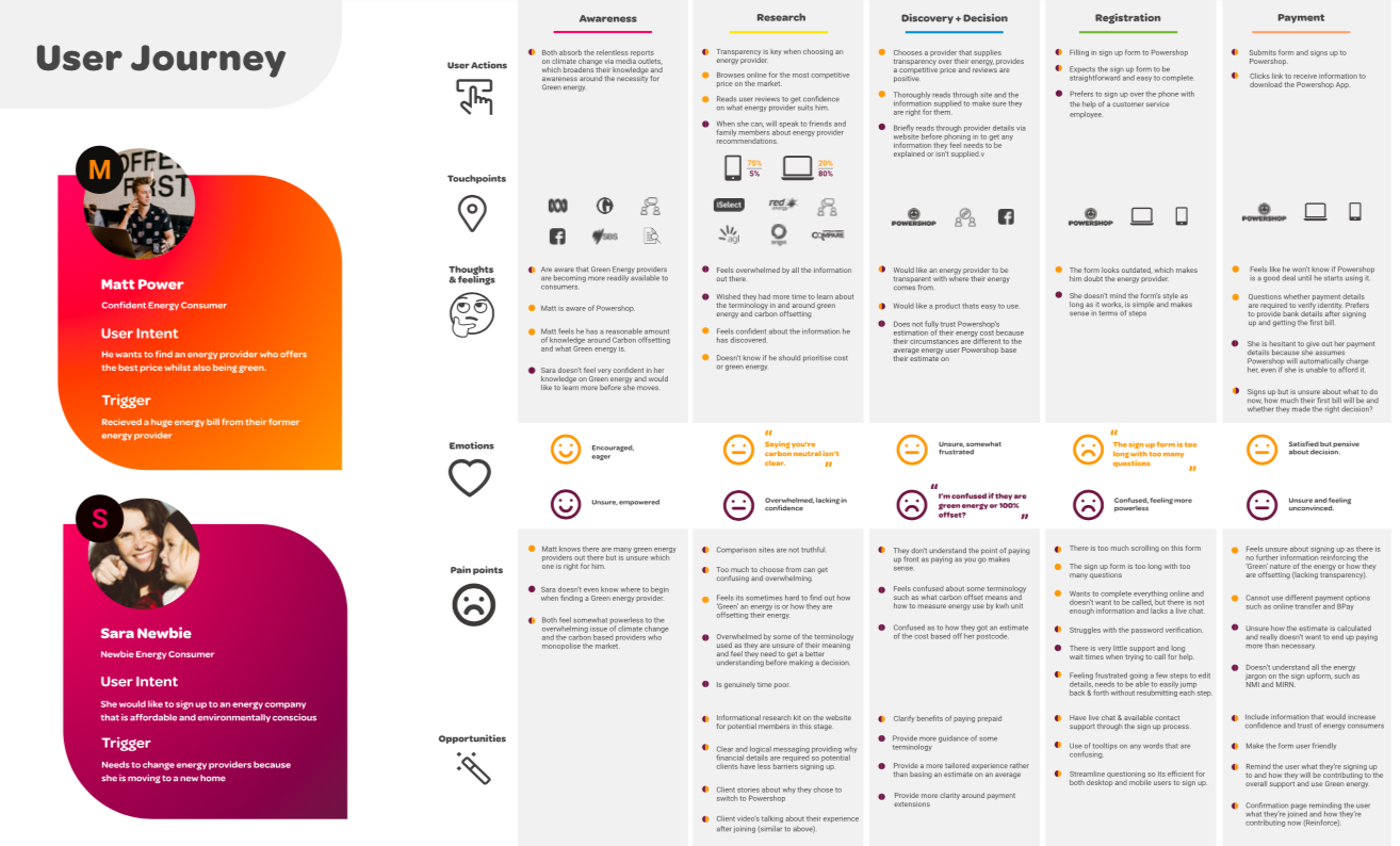 My team and I created an affinity map to divide our research findings into key themes, where we used them to create two personas. While Sara Newbie is less tech-savvy and requires more support when signing up to an energy provider than Matt Power, both personas believe that transparency of green energy claims and cost were important. Given how we saw some similarities between the two personas, we decided to consider both personas in our customer journey map.